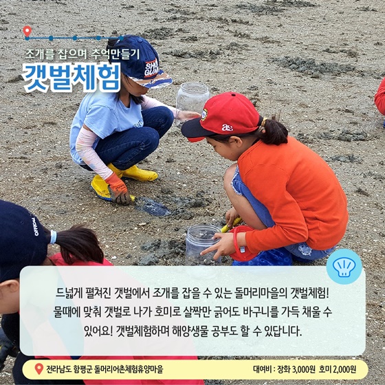 돌머리 마을에는 시원하게 뻗어있는 갯벌애서 조개를 캘 수 있답니다.
